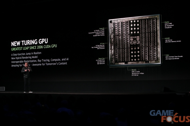 2006년 쿠다(CUDA) GPU가 탄생한 이래 가장 큰 도약을 이룬 튜링의 주요 특징은 레이 트레이싱(ray-tracing)을 가속화하는 새로운 RT 코어와 세계 최초로 실시간 레이 트레이싱을 지원하는 AI(인공지능) 추론용 텐서 코어(Tensor Core)를 갖췄다는 점이다.
