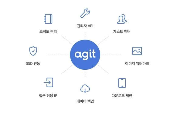 이와 함께 특정 IP접근만 허용할 수 있도록 제한하는 '접근허용IP적용', 아지트 자료의 외부 유출을 차단할 수 있는 '모바일앱 첨부파일 다운로드 제한', 첨부된 이미지를 보는 사람 기준으로 워터마크가 형성되는 '이미지 개인화 워터마크', 주민등록번호, 전화번호 등 개인정보와 관련된 글이 등록되지 않도록 설정하는 '금칙어 설정' 등의 보안 기능을 선택해서 적용할 수 있다.