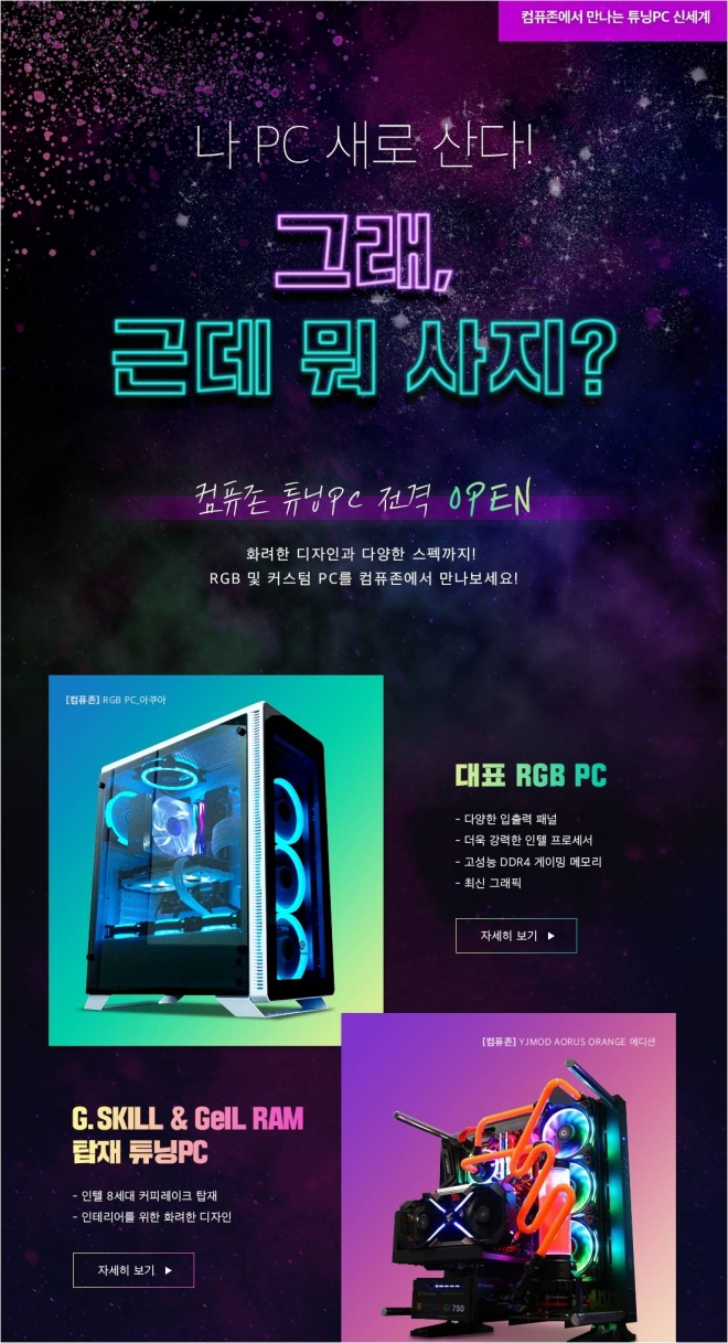 이번 튜닝 PC기획전은 화려한 디자인과 다양한 스펙의 RGB PC 및 커스텀 PC를 안정적인 AS망을 구축하고 있는 컴퓨존과 국내 명실 상부 최고의 커스텀PC 제작 능력을 보유하고 있는 영재 컴퓨터와의 업무 협력으로 이루어 졌다.