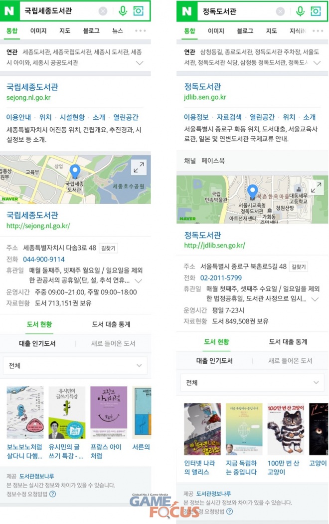 네이버 모바일 및 PC 검색창에 '정독도서관', '국립세종도서관', '제주 우당도서관' 등 전국 도서관명을 입력하면, 최신 데이터 기준 도서관 정보, 대출가능 도서, 이용 통계 등을 알아볼 수 있다.
