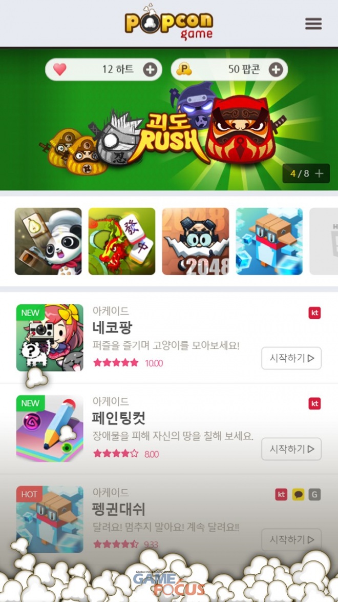 KT와 모비게임이 HTML5 기반 콘텐츠 사업을 위해 지난 6월 업무제휴를 체결하고 2개월 정도의 공동 개발 기간을 거쳐 하이퍼 개주얼 게임존 '팝콘게임'(popcongame.com)을 시범 오픈했다.