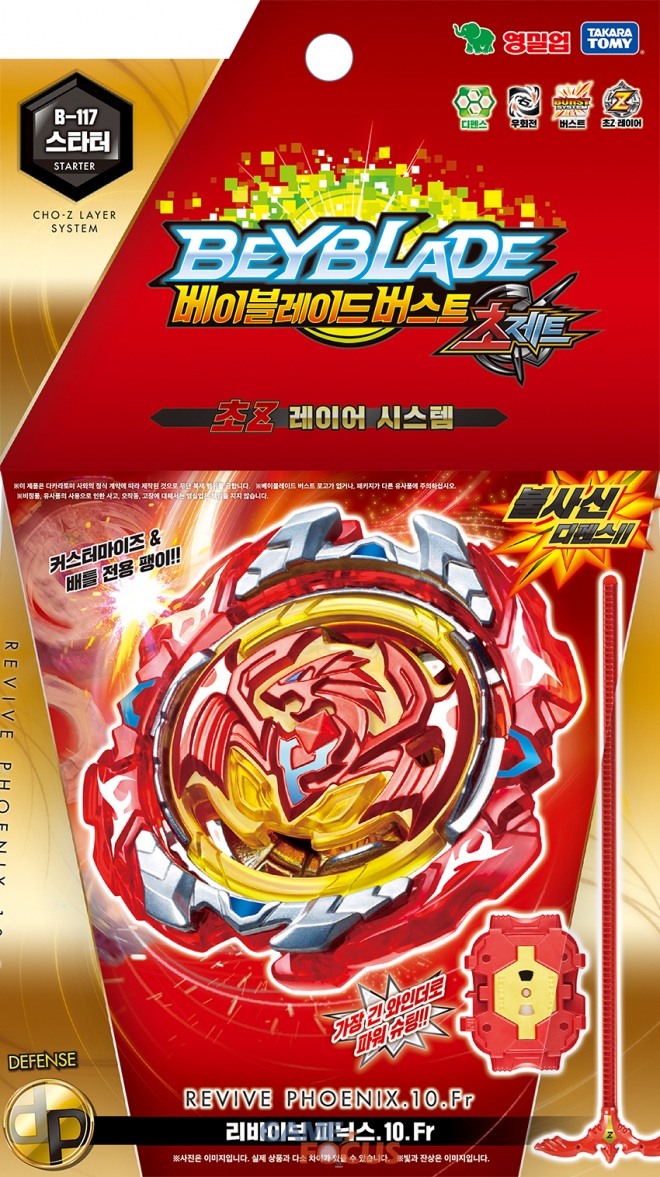 신제품 '리바이브 피닉스'는 불사조 피닉스를 모티브로 한 것으로, 애니메이션 '베이블레이드 버스트 초제트'에 등장하는 캐릭터 '파이'의 베이다. 상대로부터 공격을 받으면 레이어 바깥쪽의 리바이브아머가 제품이 분해되며 배틀에서 지는 일명 '버스트'를 막아주는 것이 특징이며, 다른 레이어보다 버스트 내성이 높다.