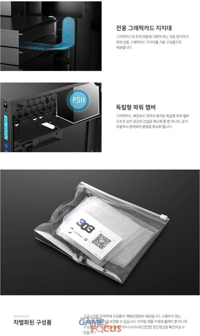 고성능 VGA 구매자들이 대부분 옵션으로 그래픽카드 지지대를 별도 구매하는 반면 인윈 303RGB 시리즈는 전용 VGA 지지대를 기본 제공하여, 무게 때문에 그래픽카드의 기판의 휘는 것을 방지할 수 있으며, 상단의 독립형 파워 챔버 영역으로 그래픽 카드, 마더보드의 설치 영역과 분리된 파워 서플라이 장착 챔버 구조를 통해 설치공간의 간섭을 최소화 할 뿐만 아니라, 공기 흐름 역시 분리되어 발열을 최소화 할 수 있으며, 인윈 303RGB 케이스는 쿨링에 최적화된 옵션을 제공하기 위해 상단의 경우 360mm의 라디에이터 장착을 지원하며, 부품 제한 없이 간편하게 냉각 환경을 구성할 수 있다.