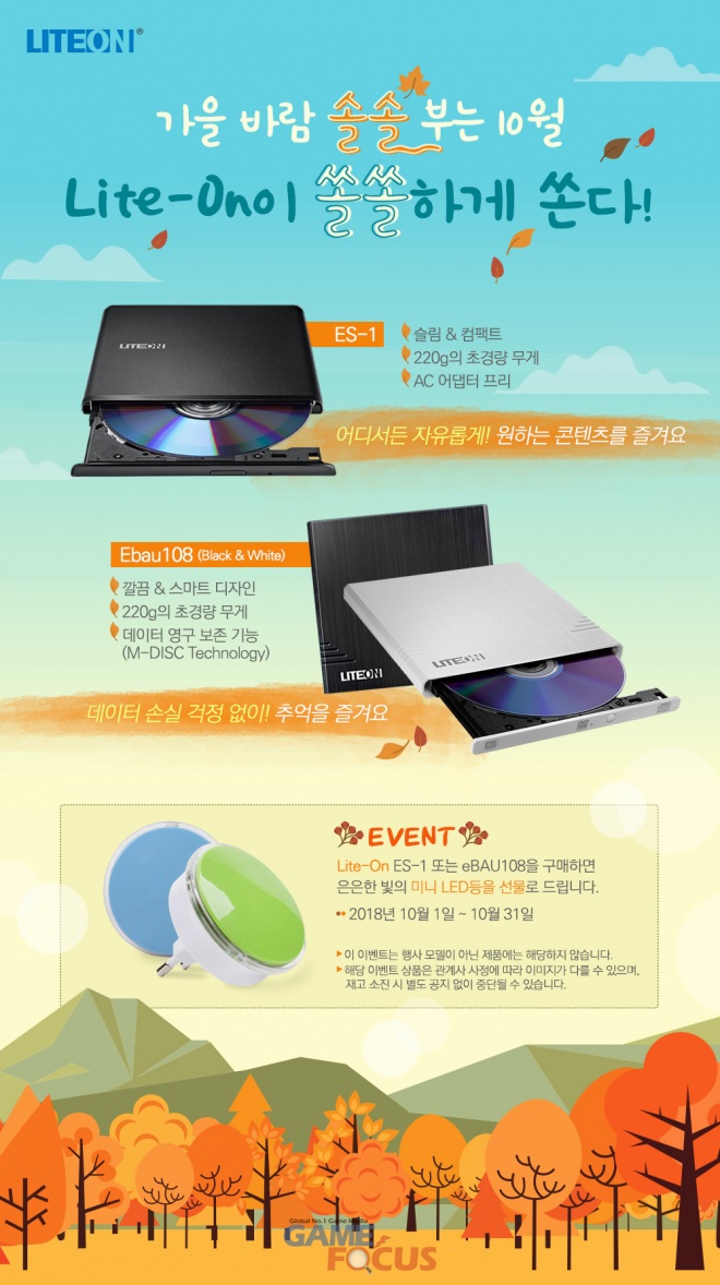 저장 장치 전문 브랜드 라이트온(Lite-On)의 공식 파트너인 태진금속(대표이사,안태균)이 ODD 유통 파트너 이선디지탈(대표이사, 정현수)를 통해 라이트온 외장형 ODD를 구매한 고객을 대상으로 '가을 바람 솔솔 부는 10월, Lite-On이 쏠쏠하게 쏜다!' 경품 이벤트를 진행한다.