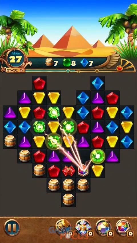 또한 인터넷에 연결이 안되어 있더라도 언제 어디서든 게임을 즐길 수 있으며 3개 또는 4개 이상의 보석을 매치하였을 경우 다양한 스킬을 활용하여 보석을 제거 할 수 있다.