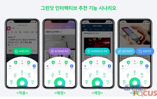 일례로, 뉴스 또는 노란 실크 원피스를 보다 '그린닷'을 터치하면, 각각AiRS(콘텐츠 추천 기술) 및 AiTEMS(상품 추천 기술)이 더욱 깊이 있는 관련 뉴스를 추천하거나, 노란색/실크소재/원피스라는 주제로 더욱 다양한 상품을 보여주는 식이다. 보고 있는 장소와 관련된 더욱 깊은 추천도, 외국어 콘텐츠에 대한 번역에 대한 필요성도 '그린닷' 터치 한번으로 해결할 수 있도록 할 예정이다.