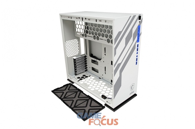 303 MSI 에디션의 좌측 패널은 3mm 두께의 강화 유리 소재가 채용되어 사용자가 언제든 시스템 내부를 한 눈에 확인할 수 있다. 우측 패널에는 보다 효과적인 시스템 내부 쿨링을 돕기 위하여 에어인테이크로서의 기능을 겸하는 감각적인 디자인의 트라이포드 패턴을 삽입했다.