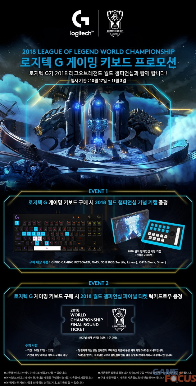 이번 프로모션은 로지텍 G가 지난 2014년 이후 4년만의 리그 오브 레전드 챔피언십 국내 개최를 기념해 마련한 특별 이벤트다. 11번가와 컴퓨존 이벤트 페이지에서 특정 로지텍 G 게이밍 키보드(G PRO 게이밍 키보드, G523 RGB, G413)를 구매한 고객이면 누구나 2018 리그 오브 레전드 월드 챔피언십 기념 키캡 및 파이널 티켓 증정 이벤트에 자동 응모된다.
