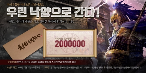또 이번 아시아 통합 서버 오픈을 기념해 다채로운 이벤트도 진행된다. 천하를 탐하다 커뮤니티에서 진행되는 이번 이벤트는 게임 내 낙양을 최초로 점령한 동맹에게 최고 200만원 상당의 회식비를 지원한다.