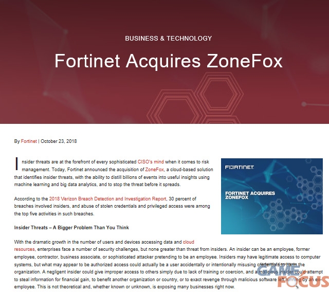 포티넷코리아(조원균 대표)가 스코틀랜드 에딘버러에 본사를 둔 클라우드 기반 '내부자 위협' 탐지 및 대응 분야의 비상장 기업 '존폭스(ZoneFox)'를 인수했다.