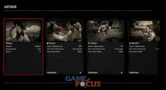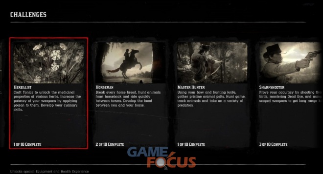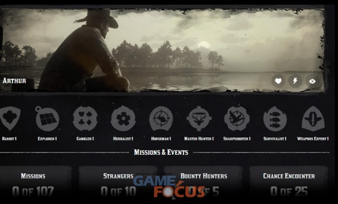 이 밖에도 플레이어가 이미 완료한 도전과 이용 가능한 도전 내역을 볼 수 있으며 플레이어를 둘러싼 세상을 돌아다니면서 마주친 모든 동식물과 수집품, 갱단에 대한 정보는 개요에 표시된다.