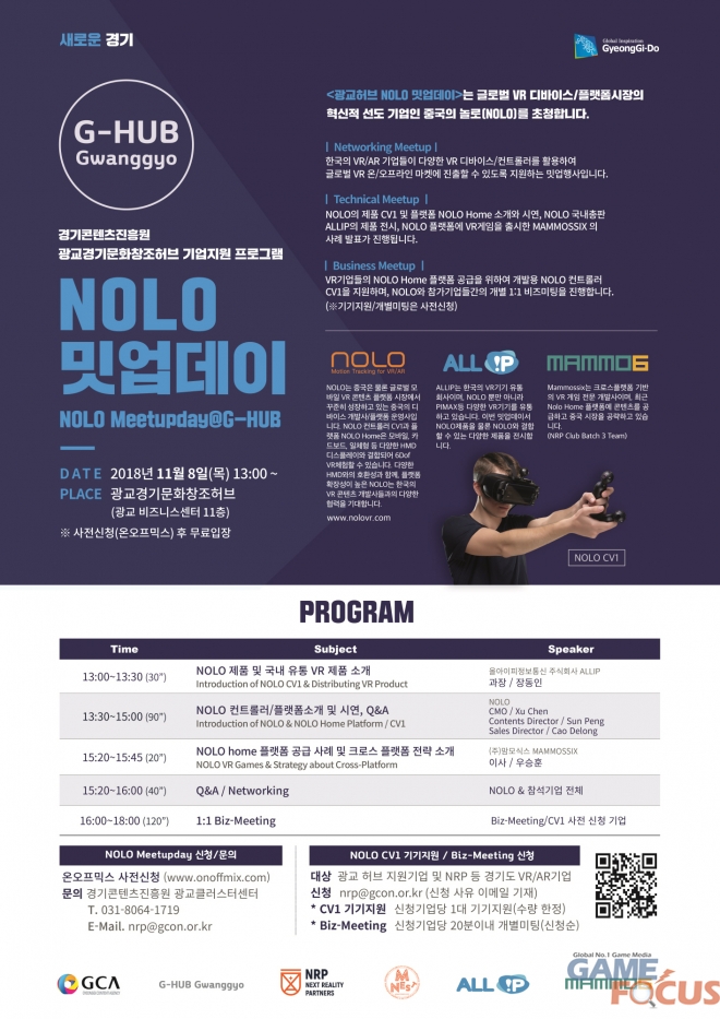 '광교허브 NOLO 밋업데이'는 NRP 지원기업을 포함하여 도내 VR/AR 기업이 글로벌 VR디바이스 및 플랫폼 시장 변화에 맞춰 콘텐츠를 개발하고 해외시장 진출이 가능하도록 지원하는 프로그램으로 진행된다.