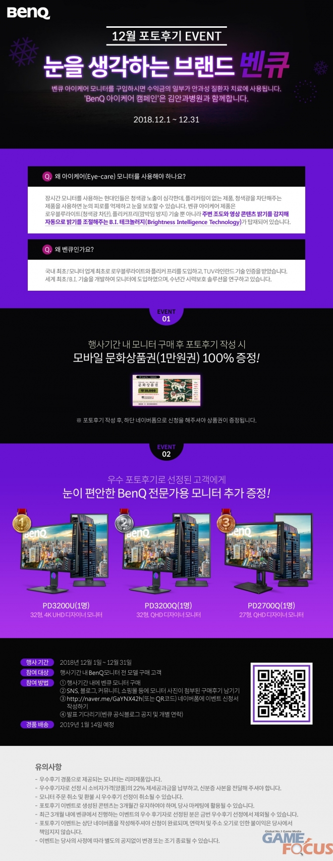 벤큐 모니터 공식 수입원 피치밸리(대표 정재윤)와 함께 진행하는 12월 포토 후기 이벤트는 벤큐 모니터 전 라인업을 대상으로 모니터를 구입하고 사진을 포함한 구매 후기를 작성한 모든 고객에게 모바일 문화상품권 (1만원권)을 100% 증정하며, 포토후기 우수리뷰로 선정된 3명에게는 벤큐 전문가용 모니터 PD시리즈(PD3200U, PD3200Q, PD2700Q)를 각 1대씩 추가로 증정하는 행사이다.