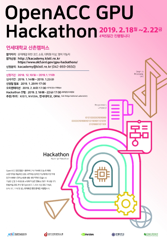 2019년 2월 18일부터 22일까지 연세대학교 신촌캠퍼스에서 진행되는 이번 해커톤은 4차 산업시대에 발맞춰 대학원 연구원 및 정부, 사설기관 연구소들이 GPU 병렬 컴퓨팅 솔루션인 오픈에이씨씨(OpenACC)와 엔비디아 쿠다(CUDA) 기술에 대한 다양한 경험을 접하고, 미래의 데이터 사이언티스트들이 GPU를 이용한 분석 프로그래밍 전문성을 확대할 수 있는 기회를 제공하기 위해 마련됐다.