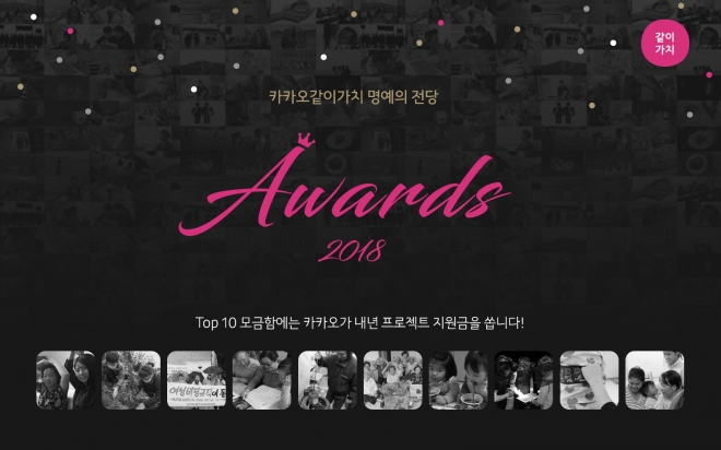 카카오같이가치는 2017년 12월부터 2018년 11월까지 진행된 총 851개의 모금 프로젝트 중 심사를 통해 총 10개의 우수 모금함과 4개의 특별상 모금함을 선정했다. 심사는 사회복지공동모금회, 한국사회복지관협회, 사단법인 시민이 함께 참여해 진행했으며, 프로젝트의 공익성, 신뢰성 등의 심사기준을 통해 선정했다.