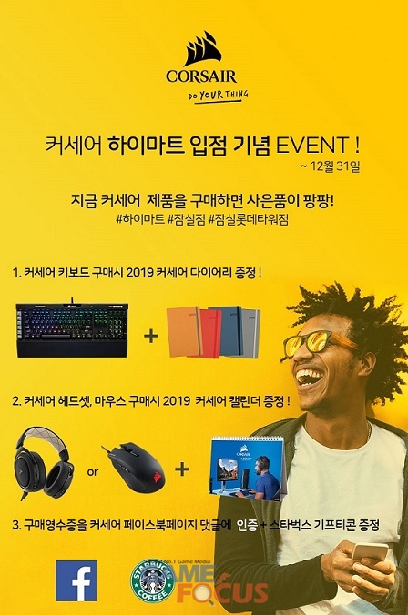 한편, 커세어는 이번 하이마트 입점을 기념한 이벤트도 하이마트 잠실점, 월드타워점에서 연다. 오는 31일까지 해당 매장에서 커세어 키보드를 구입하면 2019년 커세어 고급 다이어리를 증정하며, 마우스 구매 시 2019 탁상 캘린더를 사은품으로 제공한다. 또한 커세어 페이스북 페이지에 구매 영수증으로 댓글 인증을 하면 스타벅스 키프티콘을 추가로 선사한다.