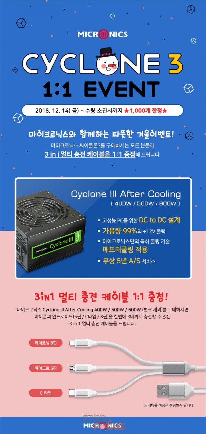 12월 14일부터 진행되는 이번 연말 행사를 통해 마이크로닉스 싸이클론III 애프터쿨링 제품 구매시 마이크로 USB, C-타입 USB, 애플 라이트닝을 모두 지원하는 3in1 멀티 충전 케이블을 1:1 증정한다. 증정되는 제품은 모든 형태의 스마트 기기 충전이 가능해 활용성이 뛰어나며 여러 기기를 동시에 연결해도 충전이 지원되는 유용한 액세서리다.