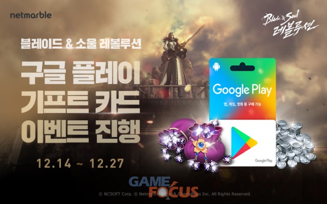 이번 프로모션을 통해 12월 27일까지 구글 플레이 기프트 카드를 구매하면 금액에 따라 '블레이드 & 소울 레볼루션' 게임 재화(흑신석 및 은화)를 차등 제공받을 수 있다.