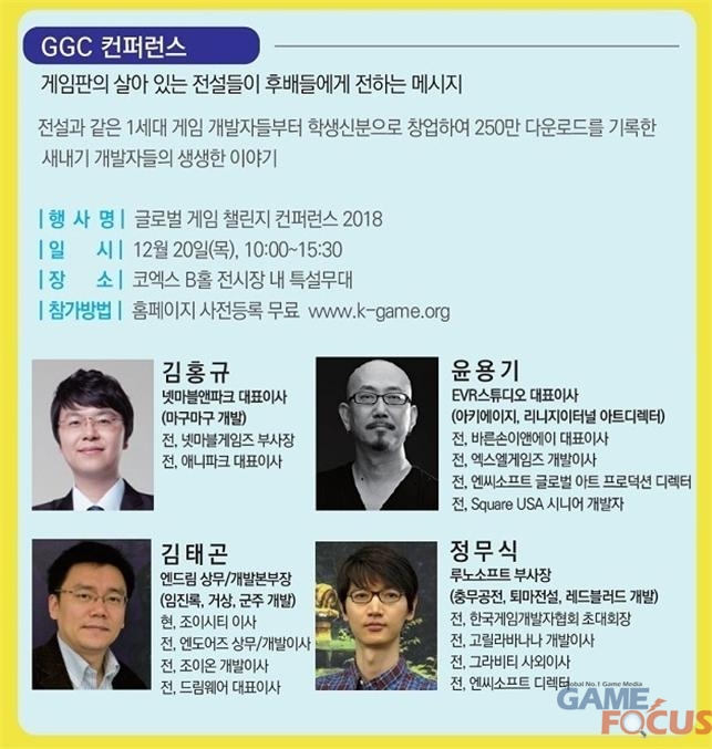 오는 20일, 코엑스에서는 전국 게임관련 대학 및 학과 연합 페스티벌 '글로벌 게임 챌린지(GGC) 2018' 행사가 개최된다. GGC 2018 개막을 기념해 열리는 콘퍼런스에 김태곤 엔드림 상무, 김홍규 넷마블앤파크 대표, 윤용기 EVR스튜디오 대표, 정무식 루노소프트 부사장 등이 강사로 참여한다.