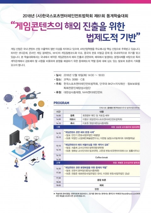 한국스포츠엔터테인먼트법학회(회장 이형규 한양대 법학전문대학원장)가 주최하고 대한상사중재원(원장 이호원)과 NHN엔터테인먼트가 후원하는 2018년 한국스포츠엔터테인먼트법학회 제61회 동계 학술대회가 12월 18일(화) 개최된다.