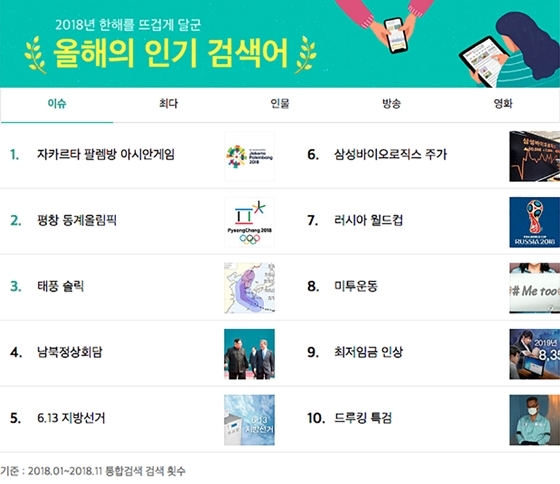 2018년에는 다양한 스포츠 행사에 이용자들의 관심이 집중됐다. 축구, 야구 등 인기 종목이 금메달을 획득하며 화제를 모은 '자카르타 팔렘방 아시안게임'이 이슈 검색어 1위를 차지했다. 그 뒤를 이어 쇼트트랙부터 봅슬레이까지 역대 최다 메달 성과를 일궈낸 '평창 동계 올림픽'이 2위, 세계랭킹 1위 독일에게 짜릿한 승리를 거둔 '러시아 월드컵'이 6위로 집계됐다.