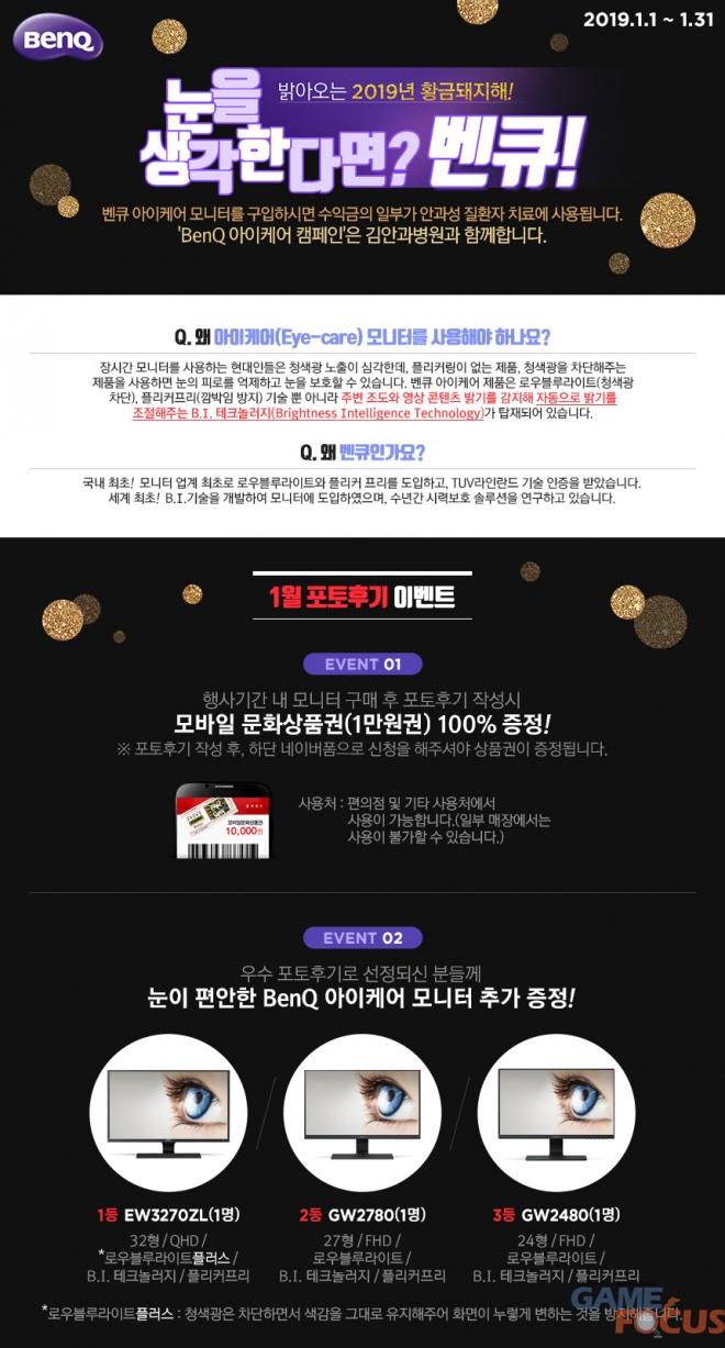 2019년 황금돼지해를 맞이한 기념으로 진행하는 1월 포토후기 이벤트는 벤큐 모니터 전 라인업을 대상으로 모니터를 구입하고 사진을 포함한 구매 후기를 작성한 모든 고객에게 모바일 문화상품권(1만 원 권)을 100% 증정하며, 포토후기 우수리뷰로 선정된 3명에게는 시력보호 기능이 강화된 벤큐 아이케어 모니터 (EW3270ZL, GW2780, GW2480)를 각 1대씩 추가로 증정한다.