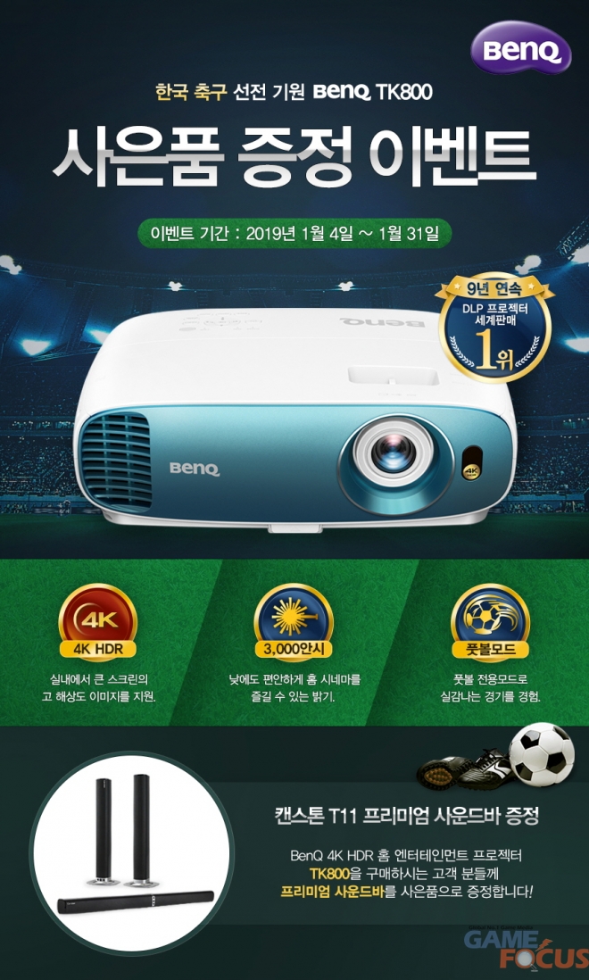 벤큐 전병렬 세일즈 팀장은 “2019년 대한민국 태극전사들의 선전을 기원하는 마음을 담아 W1700과 TK800 등 4K HDR 프로젝터 제품의 구매 사은이벤트를 진행한다”라며, “이번 사은품은 4K 가정용 빔프로젝터 구입을 고민하는 고객이 더 생생한 사운드를 즐기기 위해 음향 장비에 대한 추가 구매를 고려하고 있다는 고객 의견을 적극적으로 반영해 프리미엄 사운드바 캔스톤(T11)를 모든 고객에게 증정한다”라고 말했다.