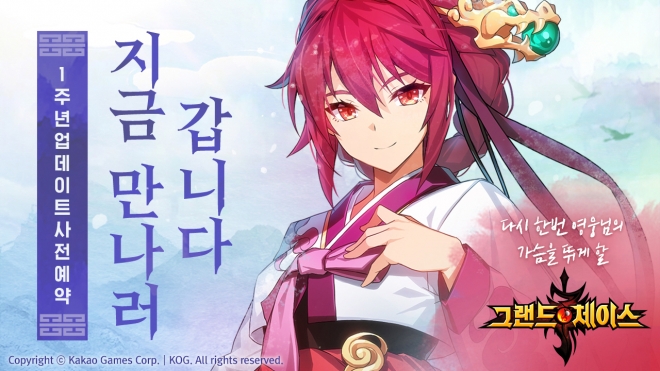 카카오게임즈(각자 대표 남궁훈, 조계현)는 8일(화), KOG(대표 이종원)가 개발하고 자사가 서비스 중인 인기 모바일 RPG '그랜드체이스'의 출시 1주년 기념 대규모 업데이트를 예고했다.