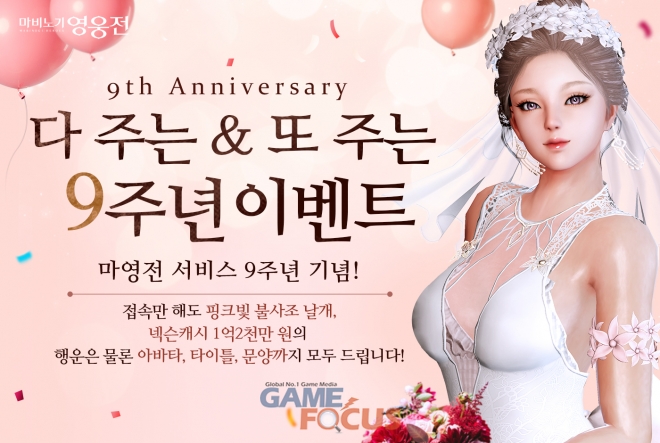 먼저, 이달 23일까지 매일 게임 출석 시 '9주년 출석 응모권'을 지급, 이를 활용해 최대 9만 원 상당의 '넥슨캐시'에 응모할 수 있으며, 전용 상점에서 '핑크빛 불사조 날개', '머리 장비 아바타 변환권', '큐미의 회복 포션' 등 다양한 아이템과 교환할 수 있다.