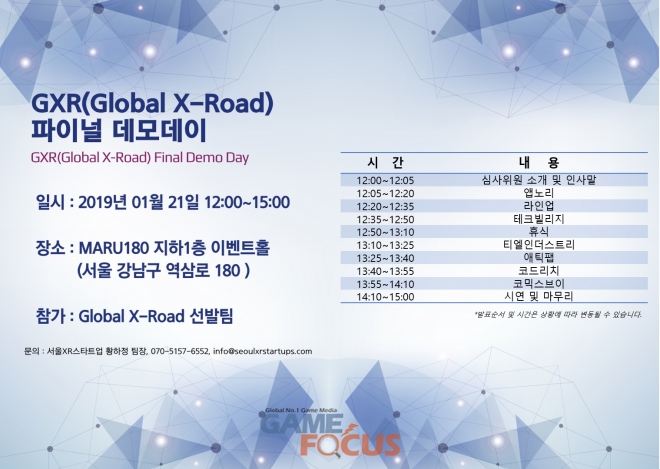 이번 '파이널 데모데이'는 약 6개월 간 진행된 GXR 프로그램의 최종 점검이 진행되는 자리로 GXR 프로그램 선발팀의 피칭 발표 및 시연이 진행된다. GXR 선발팀인 '앱노리', '라인업', '테크빌리지', '티엘인더스트리', '애틱팹', '코드리치'가 발표를 통해 그간의 성과를 선보일 예정이며, '와이제이엠게임즈'의 민용재 대표이사, 일본 'gumi'社의 쿠니미츠 히로나오 대표 등도 심사위원으로 참석해 콘텐츠 제작 및 현 VR 시장과 관련된 실용적인 조언과 따뜻한 격려를 전할 예정이다.