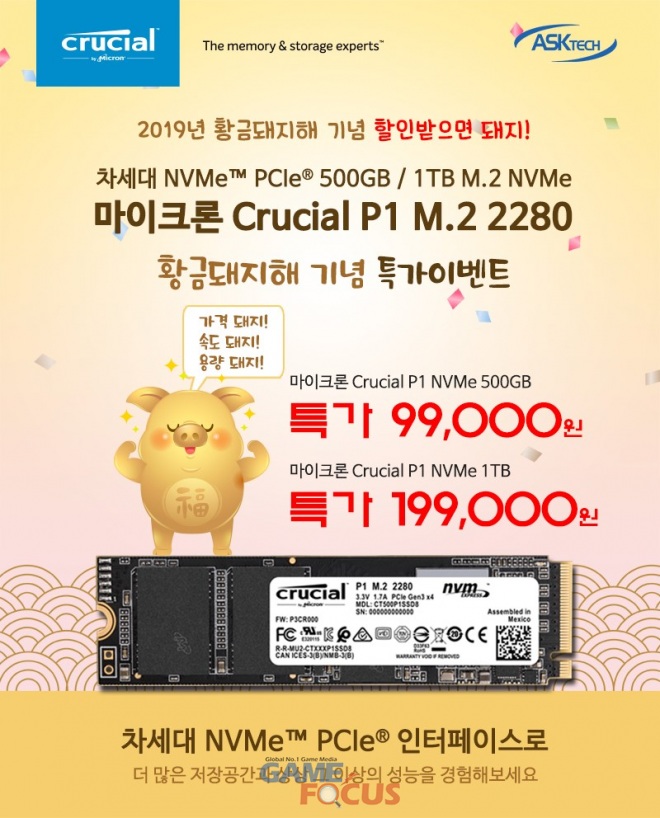 마이크론(Micron) 크루셜(Crucial) 공식 수입사인 아스크텍이 2019년 황금돼지해를 맞이해 마이크론 Crucial P1 M.2 2280 NVMe 타입의 고성능 SSD를 한정 기간 동안 할인된 가격 99,000원에 제공하는 이벤트를 실시한다.