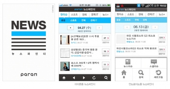 KTH ‘뉴스파인더’는 앱스토어와 안드로이드마켓은 물론이고 T스토어, 올레마켓에서도 내려 받을 수 있으며 가격은 무료이다.