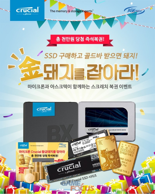 마이크론(Micron) 크루셜(Crucial)은 2019년 황금돼지해를 맞아 마이크론 공식 수입사인 (주)아스크텍을 통해 마이크론 Crucial SSD를 구매하는 모든 고객을 대상으로 황금돼지 스크레치 복권을 발행하는 이벤트를 실시한다.