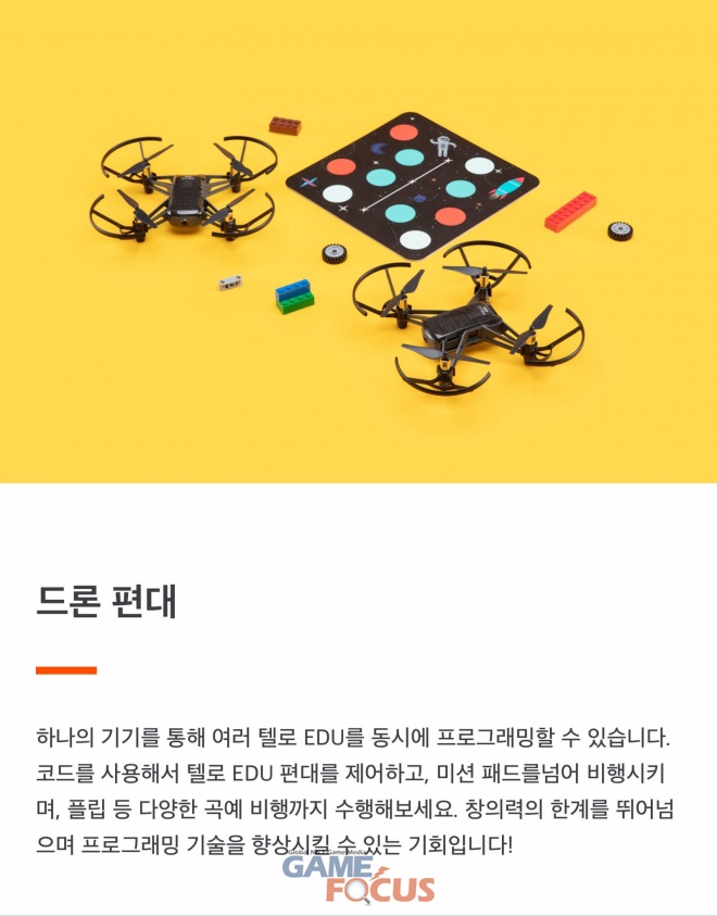 산업용 드론과 별개로 이번 자리에서는 청소년들의 코딩 및 무인항공기 기술 교육을 목적으로 개발된 RYZE사의 '텔로 EDU'도 소개된다. '텔로 EDU'는 프로그래밍이 가능한 드론으로, 지난 2018년 선보인 텔로의 후속 제품이다.