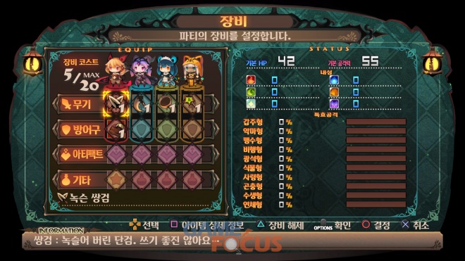 파티 장비는 '무기', '방어구', '아티팩트', '마석', '간식'으로 총 다섯 종류가 존재한다. 각 장비는 특정 직업이나 파티 전체에 다양한 효과를 부여하는 능력을 지니고 있으므로, 밸런스를 생각하며 장비를 갖추어야 한다.