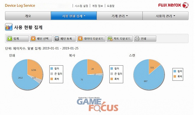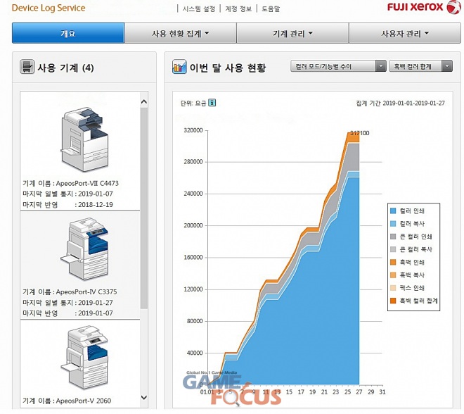 한국후지제록스 '디바이스 로그 서비스'는 클라우드를 기반으로 한 복합기, 프린터 사용량 정보 집계 서비스다. 클라우드 서버에 접속 가능한 PC만 있다면 전용 서버나 별도의 소프트웨어 없이도 기기별, 사용자별 사용량 집계가 가능하고 실시간 장비 현황 모니터링과 사용자 정보 관리 등의 기능을 사용할 수 있다.