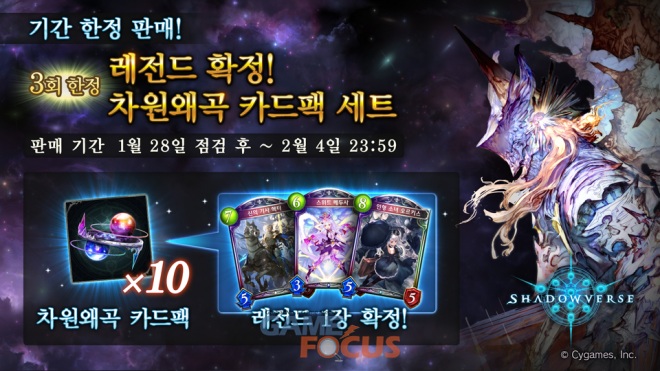 이와 함께 오는 2월 4일까지 3회 한정으로 레전드 등급 카드가 1장 이상 포함된 '레전드 확정! 차원왜곡 카드팩 세트'를 구입할 수 있다.