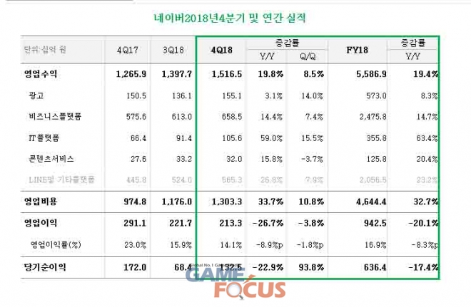 네이버(대표이사 한성숙)가 2018년 4분기에 영업수익(매출) 1조 5,165억 원, 영업이익 2,133억 원, 당기순이익 1,325억 원을 각각 기록했다.