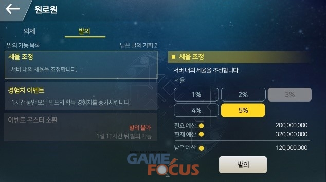 의원이 발의한 경험치 이벤트, 이벤트 몬스터 소환, 세율 조정 등 주요 안건은 전체 공지로 안내된 후 결의가 진행된다. 특히 세율은 장비 레벨업, 강화, 합성, 승급, 장비 분해 등에 적용되며, 유저가 골드를 소비하는 세율만큼의 추가 비용이 붙는다.
