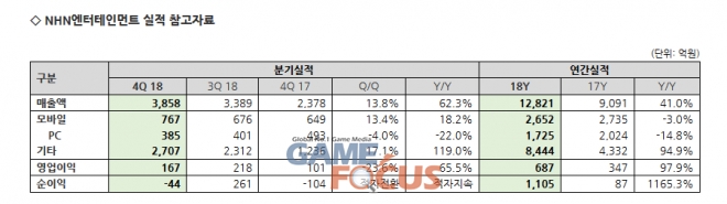 NHN엔터테인먼트의 2018년 4분기 매출은 3,858억원, 영업이익은 167억원, 당기순손실 44억원을 기록했다. 2018년 연간으로는 전년 대비 41.0% 증가한 1조 2,821억원의 매출과 97.9% 오른 687억원의 영업이익, 1165.3% 상승한 1,105억원의 당기순이익을 나타냈다.