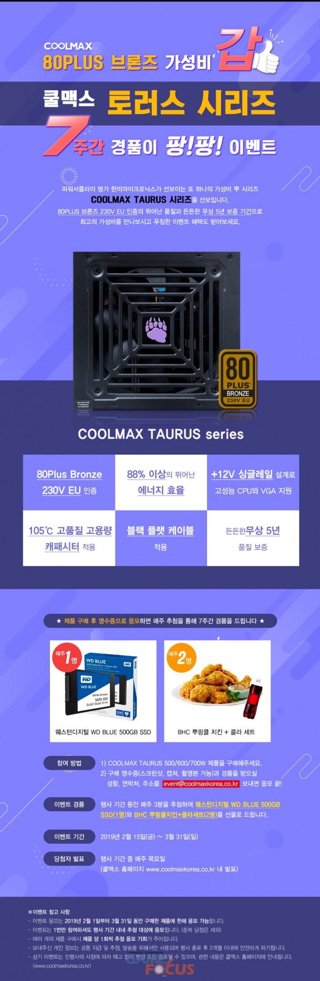 3월 31일까지 7주간 진행되는 이번 사은 행사는 쿨맥스 토러스 시리즈 구매시 추첨을 통해 매주 3명에게 '웨스턴디지털 WD BLUE 500GB SSD'와 'BHC 뿌링클 치킨 세트'를 증정한다. 제품 구매 영수증을 이메일로 보내면 간단히 응모되며, 한 번만 응모해도 행사 기간 내내 추첨 기회가 주어진다. 행사 대상 제품은 쿨맥스 토러스 500W, 600W, 700W의 세 가지 제품이며 2월 1일부터 구매한 사용자도 응모가 가능하다.