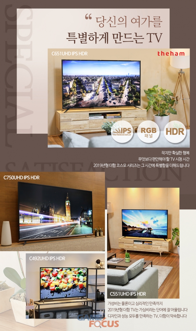 49형부터 55형, 65형, 75형까지 준비된 이번 2019년형 코스모 시리즈 지난해보다 디자인 및 성능이 향상되었으며, 특히 100% IPS RGB 패널만을 사용하는 HDR 모델을 추가해 소비자의 가심비를 자극한다.