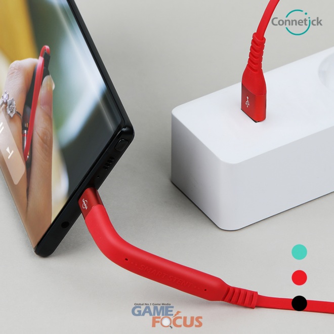 우선 ‘거치대 겸용 고속 충전 케이블’인 커네틱 스마트 스탠드 케이블은 특허 출원 제품으로 충전하면서 안정적으로 스마트폰 거치가 가능한 제품으로 별도의 거치대 없이 거치가 가능한 편의성 높은 제품이다. 해당 제품은 스마트폰 거치가 가능하도록 케이블 및 커넥터를 TPE소재를 스마트폰을 안전하게 지탱하여 강한 구부림에도 쉽게 단선되지 않아 잦은 충전으로 인해 발생하는 케이블 단선 문제를 기능과 더불어 해결하고 있으며 거치대로 사용시 원하는 각도로 조절 가능한 뛰어난 유연성을 자랑한다.