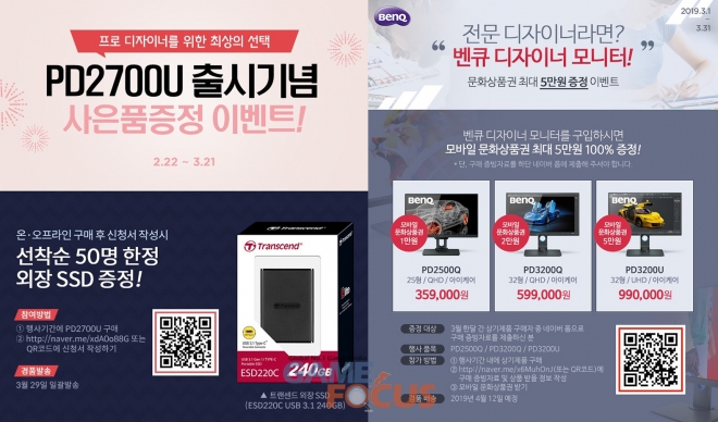벤큐(지사장 소윤석, BenQ.co.kr)가 프로 디자이너를 위한 27인치 모니터 'PD2700U'의 출시를 기념해, 해당 제품을 구입한 선착순 50명에게 75,000원 상당의 외장 SSD(240GB)를, 기존의 PD 시리즈 제품 3종을 구매하면 모바일 문화상품권 최대 5만원을 지급하는 행사를 시행한다.