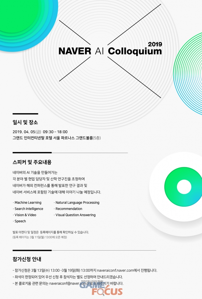 (주)네이버(대표이사 사장 한성숙)가 학계 및 산업계 AI 분야 연구자들과 서로의 기술과 노하우를 소개하고 공유하는 <네이버 AI 콜로키움 2019>를 4월 5일, 그랜드 인터컨티넨털호텔 파르나스 그랜드볼룸에서 진행한다.