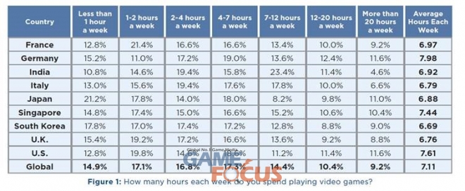 한국의 비디오 게이머들은 매주 평균 6.69시간 게임을 한다. 이는 이번 서베이에서 조사된 국가 중 최저 수치이다. 그러나 지난해 서베이 결과인 매주 4.42시간에서 51% 증가한 수치이다.