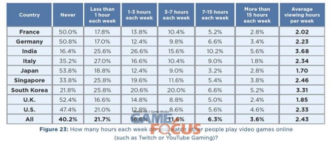 한국 게이머들은 다른 사람들의 게임 플레이를 온라인으로 매주 3.31시간(3시간 19분) 시청한다. 이는 TV에서 전통적인 스포츠 경기를 보는 2.79시간(2시간 47분)보다 높은 수치이다. 18~35세의 게이머들은 다른 이들의 게임 플레이는 매주 4.34시간, TV에서 스포츠 경기는 매주 2.35시간 시청한다.