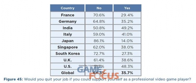 직장이 있는 게이머의 27.3%는 그들이 프로게이머로서 지원받을 수 있다면 직장을 그만두겠다고 답변했다. 이는 이번 조사에서 두번째로 낮은 수치이며, 일본이 최저를 차지했다.