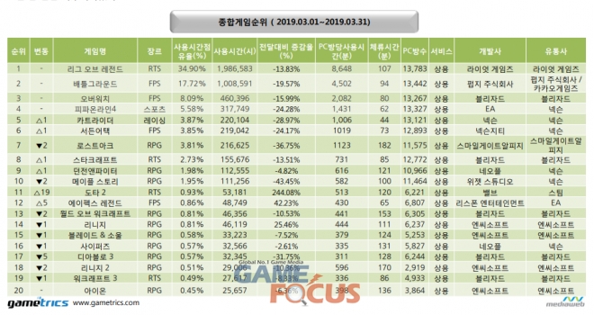 게임트릭스가 제공하는 2019년 3월 월간 종합게임순위에 따르면, 10위권 내에서는 모든 게임의 전달 대비 사용시간이 감소했다. 특히 '로스트아크'는 지난 달에 이어 사용시간이 36.75% 감소했다. '메이플 스토리' 또한 전달 대비 사용시간이 43.45% 감소했다.