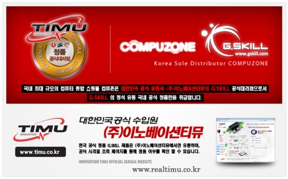 세계적 명성의 고성능 메모리 제조사 G.SKILL (지스킬), CORSAIR (커세어), GEIL (게일)과 프리미엄 PC케이스 브랜드 BITFENIX (비트피닉스)의 국내 공식 유통사이자 PC 하드웨어 관련 여러 고성능 제품을 전문적으로 제조, 유통해 온 ㈜이노베이션티뮤(http://www.timu.co.kr 대표: 이광재)는 국내 최대 규모 PC관련 전문 쇼핑몰인 ㈜컴퓨존(http://www.compuzone.co.kr 대표: 노인호)과 국내 공식 정품인 지스킬의 공식 총판 계약을 체결하게 되었다고 밝혔다.